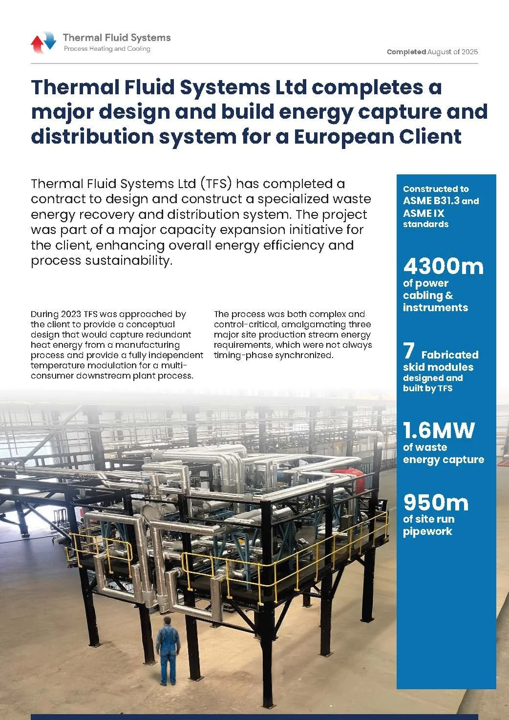 Thermal Fluid Systems Ltd (TFS) has successfully delivered a major waste energy capture and distribution system for a European manufacturing client. Completed in August 2025, the project converts redundant process heat into a controlled, reusable energy source, supporting the client’s expansion plans while improving efficiency and sustainability.